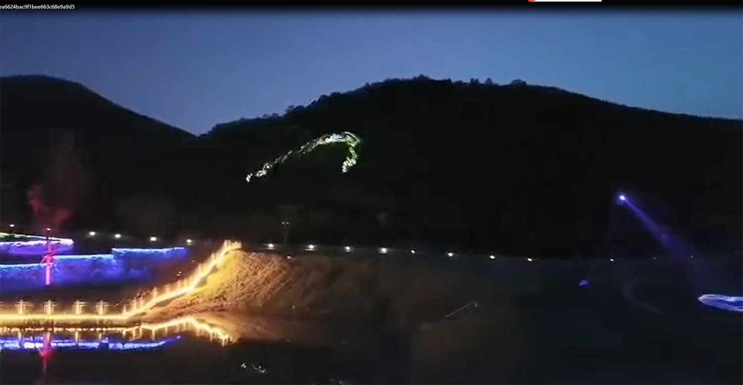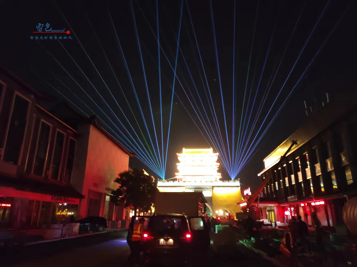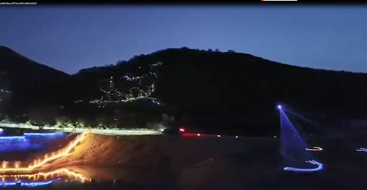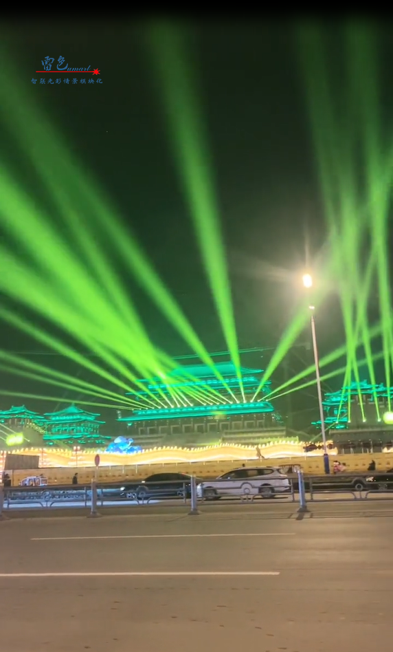 2、我們雷色光電參與了鎮北臺的亮化工程,并使用了彩色防水激光表演機等多種燈光設備和技術。這些設備和技術不僅能夠營造出豐富多彩的光影效果,鎮北臺的重要建筑和景點都被精心點亮,如城墻、敵樓、角樓等,通過燈光效果的展現,使得這些建筑和景點在夜晚煥發出新的生機和活力。