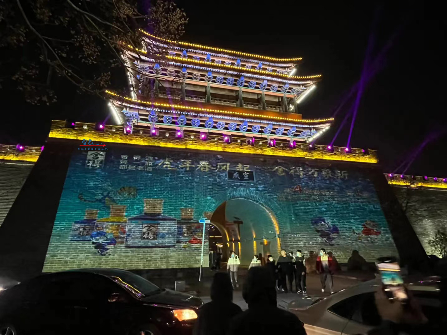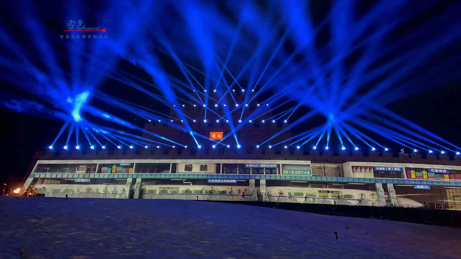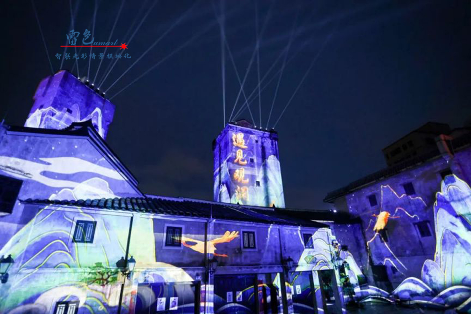 2、我們雷色光電參與了鎮北臺的亮化工程,并使用了彩色防水激光表演機等多種燈光設備和技術。這些設備和技術不僅能夠營造出豐富多彩的光影效果,鎮北臺的重要建筑和景點都被精心點亮,如城墻、敵樓、角樓等,通過燈光效果的展現,使得這些建筑和景點在夜晚煥發出新的生機和活力。